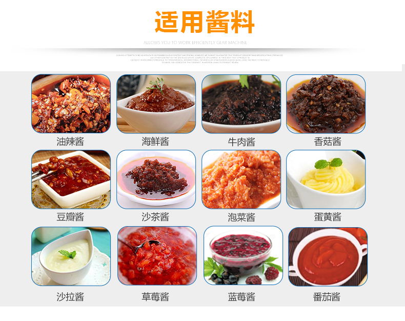 8、該醬類灌裝機大小瓶調(diào)節(jié)方便,配置自動升降裝置。