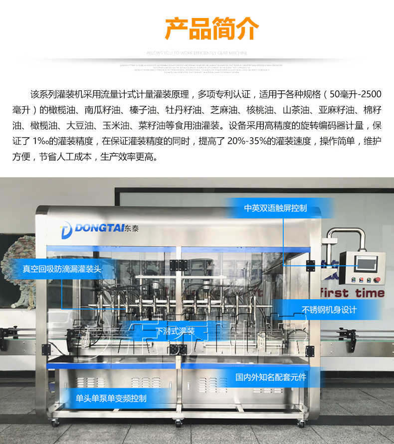 東泰機械至今有著二十年的研發(fā)生產(chǎn)經(jīng)驗,擁有著精良的技術(shù)團隊,東泰研發(fā)的橄欖油自動灌裝機,橄欖油灌裝流水線都是機電一體的新型設(shè)備,橄欖油自動灌裝機計量采用高精度流量計與微電子數(shù)控儀表相結(jié)合的方式,灌裝精度相當高,還可以方便的進行無級調(diào)解灌裝容量,非常直觀,操作非常簡單。選擇包裝設(shè)備就要選經(jīng)驗豐富、技術(shù)超前,設(shè)備完善的的大企業(yè),東泰機械通過二十多年的努力和發(fā)展,現(xiàn)已成為集科研、設(shè)計制造、成套供應(yīng)、技術(shù)咨詢服務(wù)、工程總承包為一體的高科技型企業(yè)。東泰期待與您的合作,我們互利共贏!
