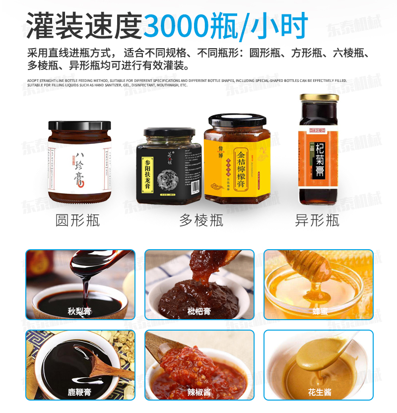 蜂蜜灌裝機設備廠家憑借著自己特有的操作設計使得該機簡單,維修方便,穩(wěn)定性強,運行速度快等優(yōu)勢,為商品生產(chǎn)廠家節(jié)約了生產(chǎn)成本和時間的同時,也為各行各業(yè)帶來了更多的經(jīng)濟效益,自動化蜂蜜灌裝機而且隨著應用的增多,技術、性能也有很大的提高,提升了整體行業(yè)的水平,尤其一些創(chuàng)新、技術開發(fā)等積極性行動,對整個企業(yè)的發(fā)展非常有利,并且蜂蜜灌裝機設備廠家還想到了避免由于原材料過多的與人接觸所造成的污染,對該機采用了全不銹鋼制作極大的保證了商品的生產(chǎn)質(zhì)量。因此,自動化蜂蜜灌裝機的出現(xiàn)為不少商品生產(chǎn)廠家增加了經(jīng)濟利潤。